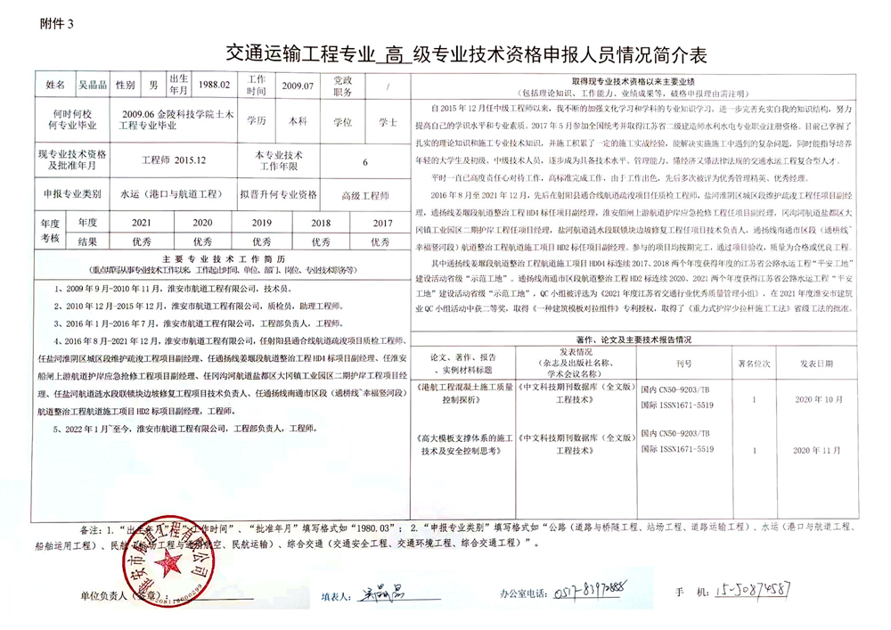 關(guān)于吳晶晶同志申報(bào)交通運(yùn)輸工程水運(yùn)(港口與航道工程)專業(yè)高級(jí)工程師的公示